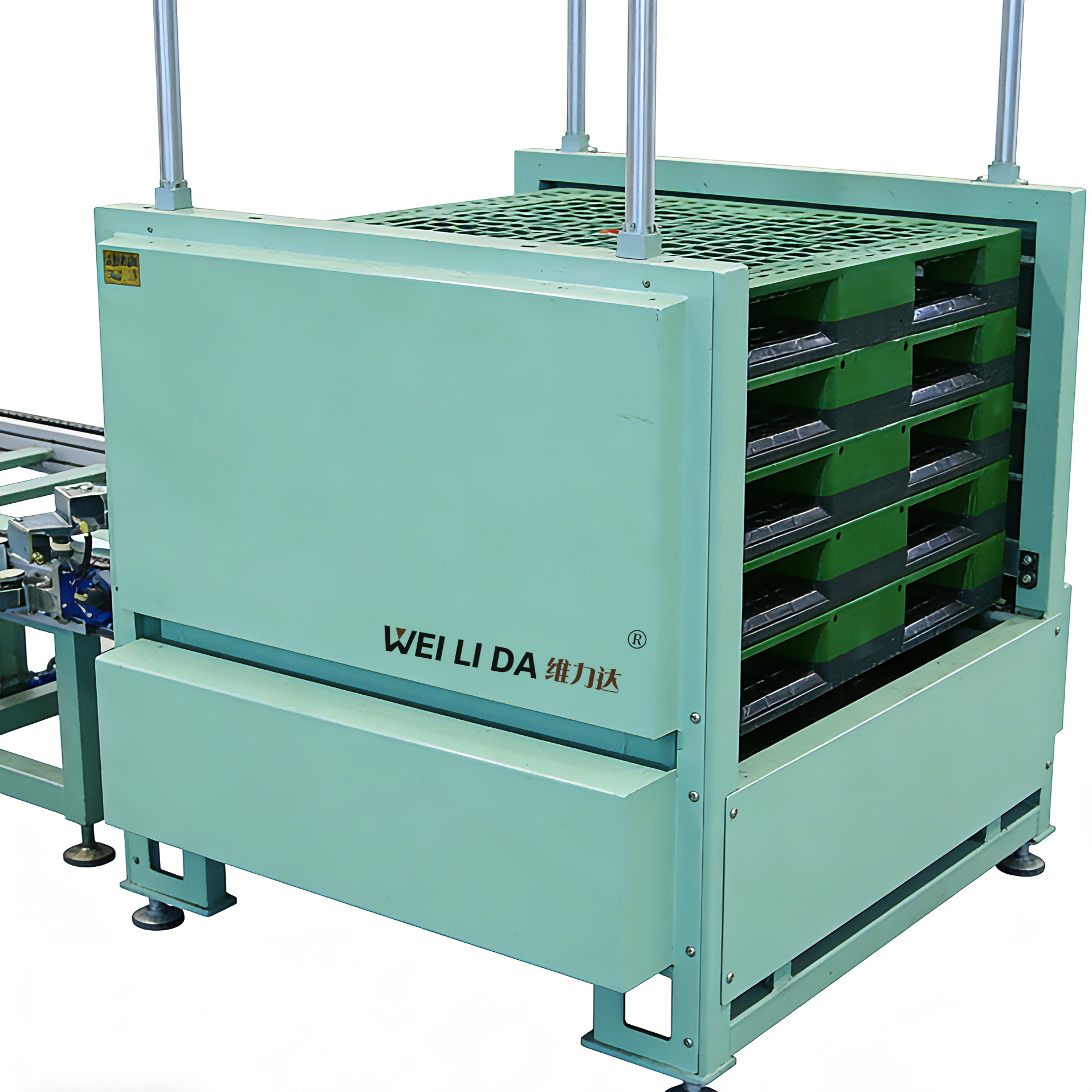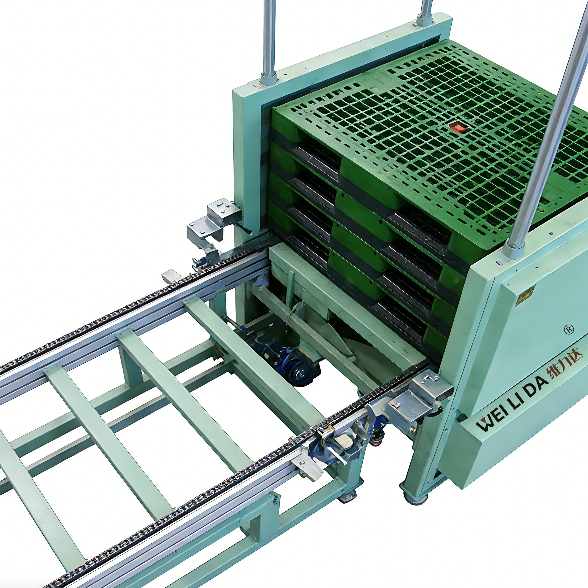 也常称为托盘拆盘机、栈板拆垛机,是自动化仓储、物流及生产流水线中用于自动拆分堆叠托盘的专用设备,核心作用是替代人工完成托盘的分离、整理与输送,适配各类标准化托盘(如木托盘、塑料托盘)的自动化作业流程。核心用途:自动化仓储出入库环节、生产流水线的上料 / 下料配套、物流集散与装卸货环节、托盘回收与循环利用场景